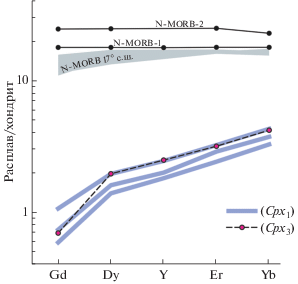 Концентрации Gd, Dy, Y, Er и Yb в реакционном расплаве, рассчитанные по составу обогащенных Cpx1 и Cpx3 из наиболее высокотемпературной локальной ассоциации Opx3 + Spl3 + Ol. Для сравнения показаны обобщенные составы N‑MORB-1 и -2 (Sun, McDonough, 1989; Hofmann, 1988 соответственно). MORB 17° с.ш. – валовый состав базальтовых лав из НВП (см. рис. 1) в широтном интервале 17°06′–17°10′ с.ш. (В.Е. Бельтенев, неопубликованные данные). Концентрации элементов нормированы к хондриту С1 (Sun, McDonough, 1989).