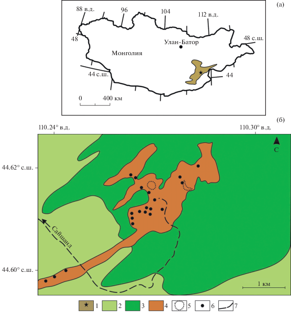 Восточно-Монгольская угленосная провинция на карте Монголии (а) и схематическая геологическая карта пирометаморфического комплекса Хамарин-Хурал-Хид (б). 1 – положение пирометаморфического комплекса Хамарин-Хурал-Хид в пределах угленосной провинции; 2 – песчано-конгломератовая толща Дзунбаинской свиты (K1); 3 – глины, песчаники, угленосные аргиллиты Дзунбаинской свиты (K1); 4 – пирогенно измененные осадочные породы, клинкеры и паралавы; 5 – участок угольного пожара 1932–1949 гг. (слева на схеме) и пещеры буддийского монастыря Хамарин-Хийд (справа на схеме); 6 – точки опробования; 7 – дорога в г. Сайшанд.
