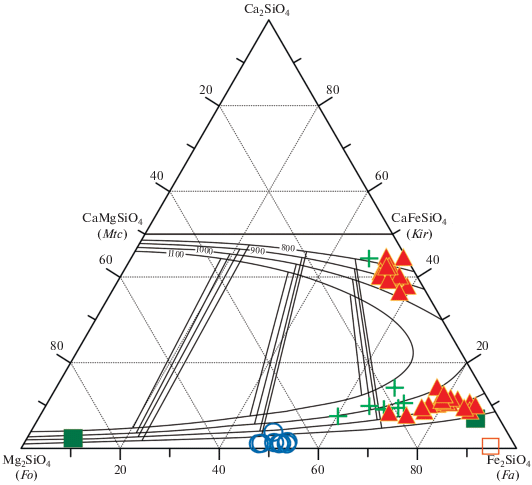 Только в двух образцах нефелинсодержащей паралавы (обр. MN-1419, MN-1425) обнаружены кирштейнит и Ca-фаялит (табл. 2, ан. 20–23). Киршейнит редко встречается в породах земного происхождения (мелилит-нефелиновых лавах, кимберлитах, скарнах, техногенных породах, паралавах) и наиболее характерен для метеоритов (железистых, ахондритов, хондритов) (см. обзоры в Sokol et al., 2002; Melluso et al., 2010). Кирштейнит и Ca-фаялит являются характерными минералами мелилит-нефелиновых паралав Нилгинского пирометаморфического комплекса (Перетяжко и др., 2018). Согласно экспериментальным и петрологическим данным, кристаллизация Ca-Fe оливинов наблюдается в ненасыщенных по SiO2 силикатных расплавах при низком давлении и высокой температуре (1100–850°С). По экспериментально определенной поверхности сольвуса (Davidson, Mukhopadhyay, 1984) распад гомогенного твердого раствора Ca-Fe оливина и эволюция составов кирштейнита и Ca-фаялита в паралавах комплекса Хамарин-Хурал-Хид могли происходить в температурном интервале 950–850°С (рис. 10), а при дальнейшем охлаждении пород катионный обмен между сосуществующими фазами прекратился.