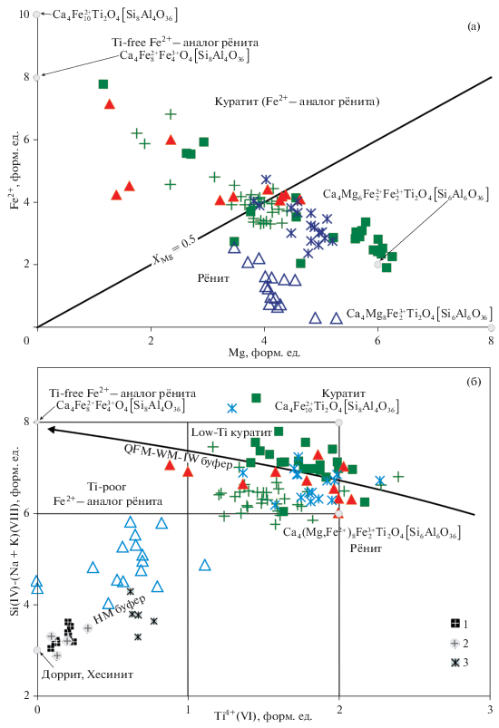 В матриксе всех нефелин-мелилитовых паралав обнаружены микролиты минералов рёнит-куратитовой серии, большинство из которых находится в поле рёнита и низкотитанового куратита (рис. 11). Эти минералы формировались в паралавах, имеющих величину CIPW норм Ne# = Ne/(Ne + + Ab + Or + Lc) 0.60–0.94 и значение XMg = = MgO/(MgO + FeO + Fe2O3), мол. % 0.63–0.88 (табл. 1, ан. 10–18). Это согласуется с экспериментальными данными, по которым рёнит кристаллизуется в ненасыщенных по SiO2 мафических щелочных расплавах при значениях Ne# > 0.18 и XMg > 0.46 (Kunzmann, 1999). Установлено также, что рёнит в ассоциации с оливином, клинопироксеном, плагиоклазом без магнетита кристаллизуется в базанитовых расплавах в температурном интервале 1082–1100°C и давлении 1 бар в восстановительных условиях вблизи IW буфера, а совместно с магнетитом – около NNO буфера (Boivin, 1980). По данным (Grapes, Keller, 2010), куратит (Fe2+– аналог рёнита) в основных щелочных вулканических породах (тефритах и лимбургитах) комплекса Kaiserstuhl (Германия) образовался при 1068–1137°С, давлении <50 бар и летучести кислорода около QFM буфера. Из этого можно заключить, что кристаллизация рёнита в паралавах начиналась при температуре около 1100°C в относительно восстановительных условиях, а поздние зоны микролитов минералов рёнит-куратитовой серии формировались при летучести кислорода на уровне NNO и QFM буферов. Только в образце паралавы MN-1411 для рёнита характерно преобладание Fe3+ (5–6 форм. ед.) над другими катионами (рис. 11б), что свидетельствует о росте летучести кислорода при его кристаллизации, вероятно, до уровня HM буфера по аналогии с условиями образования доррита в Wyoming паралавах (Cosca et al., 1989). Многочисленные находки микролитов Fe3+-плеонаста в этой паралаве (рис. 9) также согласуются с кристаллизацией расплава в окислительных условиях.
