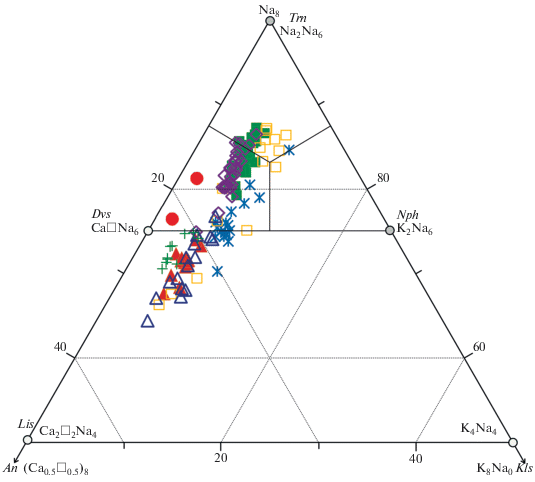 На завершающей стадии формирования паралав интерстиции матрикса заполняет Ca-содержащий минерал из группы нефелина. Его состав соответствует давидсмититу, но во многих анализах наблюдается более высокая сумма Ca и вакансии относительно идеальной стехиометрии, что приводит на диаграмме Na–K–(Ca◻) к смещению точек состава по направлению к лисетиту (рис. 12). Из расчетов формул минерала следует, что рост Si, Ca и снижение Al, Na при постоянном количестве K компенсируется за счет увеличения доли вакансии по гетеровалентной схеме: Si4+ + + Ca2+ + ◻ → Al3+ + 3Na+ (табл. 2, ан. 27–31). До настоящего времени было описано всего одно местоположение давидсмитита в высокобарической ассоциации с лисетитом и другими редкими минералами из эклогитов Норвегии (Kechid et al., 2017). Лисетит имеет идеальную формулу CaNa2Al4Si4O16 и близкую к полевошпатовой структуру, отличную от нефелина (Rossi et al., 1986). На основании имеющихся данных без структурных и спектроскопических исследований мы не можем однозначно диагностировать в паралавах Ca-содержащий минерал из группы нефелина как давидсмитит.