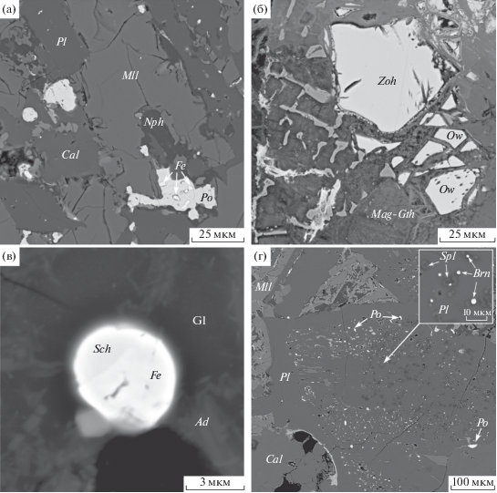 Фрагменты матрикса паралав. (а) – включения железа в пирротине, обр. MN-1420. (б) – зоарит и оуенсит в магнетит-гетитовом агрегате из краевой зоны крупного выделения пирротина, обр. MN-1425. (в) – совместное срастание (закристаллизованная капля Fe-P расплава) шрейберзита (Fe3P) и железа в обогащенном Al силикатном стекле c включениями, предположительно, андалузита, обр. MN-1420. (г) – многочисленные включения баррингерита (Fe2P), пирротина и шпинели в центральной (ранней) зоне фенокриста плагиоклаза, обр. MN-1412. Изображения в BSE. Fe – самородное железо, Zoh – зоарит, Ow – оуенсит, Sch – шрейберзит, Brn – баррингерит, Ad – андалузит, Mag-Gth – магнетит-гетитовый агрегат. Остальные обозначения см. на рис. 6.