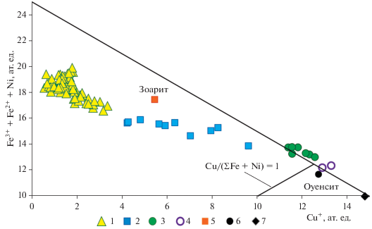 Составы бариевых Fe-Cu сульфидов из группы джерфишерита. 1–3 – составы обогащенного железом бариевого сульфида, предположительно, зоарита (табл. 3, ан. 1–3). 4 – составы, соответствующие оуенситу. 5 – зоарит, по (Galuskina et al., 2017; Галускина и др., 2017). 6 и 7 – оуенсит, по (Laflamme et al., 1995) и (Шарыгин, 2016) соответственно. Cu/(ΣFe + Ni) – отношение атомов в формуле.