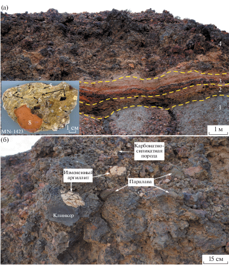 Коренные обнажения пирогенных пород в центральной части комплекса Хамарин-Хурал-Хид: (а) – разрез пирогенной толщи с врезкой для образца карбонатно-силикатной породы MN-1423. (б) – детализация слоя брекчированных пирогенных пород. На фото (а) выделены пунктирной линией участки: 1 – свалы пород в нижней части разреза, 2 – аргиллит с прослоями алевропесчаника, 3 – реликты частично выгоревших слоев угля (черное) среди пирогенно измененных аргиллитов, 4 – брекчированные пирогенные породы. На врезке – фото обр. MN-1423: 5 – ксенолиты известняка с тонкими черными прослоями Na-алюмосиликатного (близкого по составу к альбиту-анортоклазу) стекла, 6 – флюидальные слои, выполненные кальцитом, 7 – выделения черного Na-алюмосиликатного стекла во флюидальном матриксе, 8 – ксенолит пирогенно измененного аргиллита.