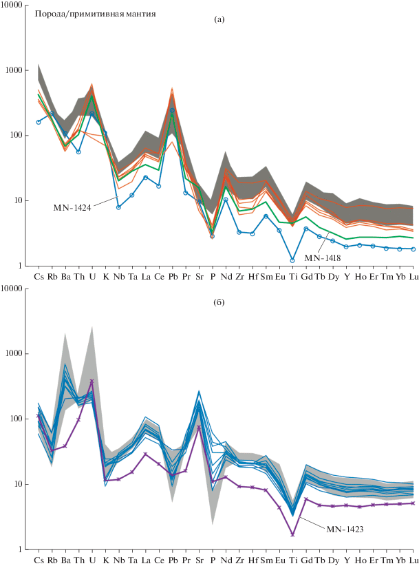 Валовые составы и концентрации элементов-примесей определены в нескольких образцах алевропесчаника, аргиллита, пирогенно измененных осадочных пород и клинкеров (табл. 1, ан. 1–9). При прокаливании проб >105°С происходит потеря H2O+: из аргиллита 4.66 мас. %, обр. MN-1418, и 1.37 мас. % из измененного белого аргиллита, обр. MN-1422 (см. рис. 2б). Флюидальная карбонатно-силикатная порода в обр. MN-1423 (рис. 2а, врезка) имеет высокие концентрации CaO, SiO2, CO2, Al2O3 и значительную примесь Na2O (табл. 1, ан. 4). На TAS-диаграмме вулканических пород безводные составы аргиллита, алевропесчаника, измененных пород осадочной толщи и клинкеров находятся в поле низкощелочных дацитов и риолитов при вариациях концентрации SiO2 68–81 мас. % и суммы щелочей (Na2O + K2O) 2–5.3 мас. % (рис. 3). Клинкеры содержат стекло преимущественно кислого состава, в котором SiO2 > 67 мас. % и K2O (3–8 мас. %) преобладает над Na2O (2–5 мас. %). В этой группе пород минимальные концентрации примесных элементов имеют алевропесчаник и аргиллит (обр. MN-1424, MN-1418), а максимальные – клинкеры. Для мультиэлементных нормированных к примитивной мантии распределений пород характерна близкая форма с максимумами Cs, U, La, Pb, Nd, Sm, Gd и минимумами Ba, Nb, P, Zr, Hf, Ti, Y (рис. 4а).