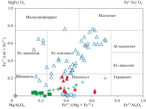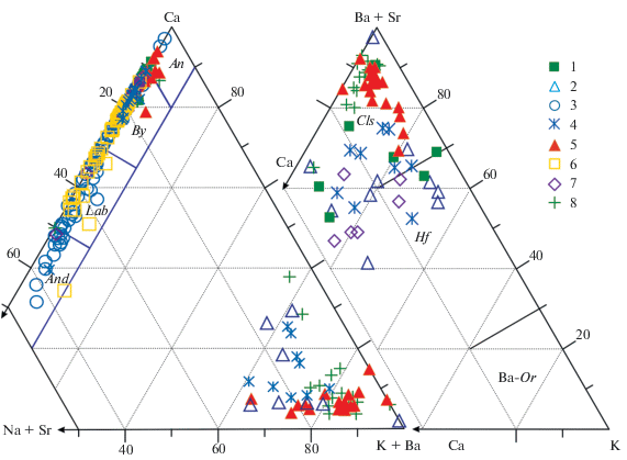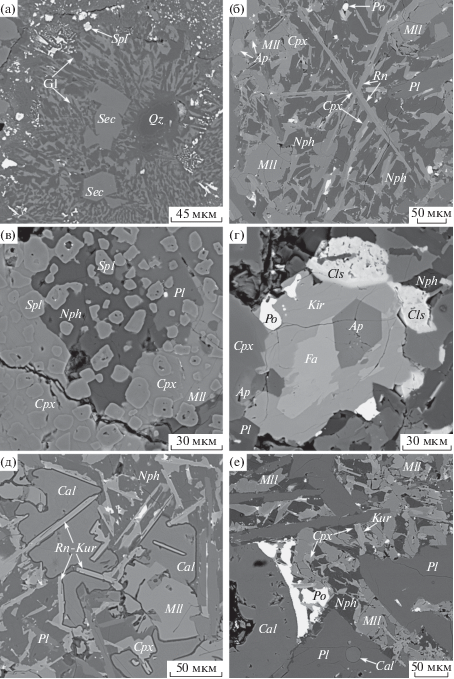 Первыми в мафических расплавах паралав кристаллизовались микролиты шпинелидов с большими вариациями содержаний Fe2+, Fe3+, Al и Mg (рис. 5в, 9). Затем следовало образование минералов фенокристной ассоциации – битовнита-лабрадора-андезина, Al-клинопироксена и мелилита. Далее в интерстициях между фенокристами кристаллизовались Ca-Fe оливины, K-Ba полевые шпаты (цельзиан, гиалофан), фторапатит, минералы рёнит-куратитовой серии, плеонаст, пирротин, барит и минерал из группы нефелина. Паралавы являются полнокристаллическими породами и не содержат в матриксе остаточного стекла.