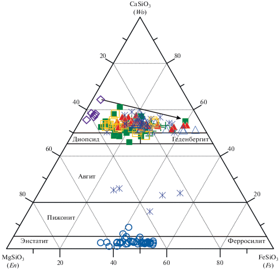 Кристаллохимические формулы минералов рассчитывали в программном комплексе CRYSTAL (Перетяжко, 1996). Для оценок условий кристаллизации минералов использовали экспериментальные данные из работ (Boivin, 1980; Mukhopadhyay, Lindsley, 1983; Davidson, Mukhopadhyay, 1984; Kunzmann, 1999; Haefeker et al., 2012).