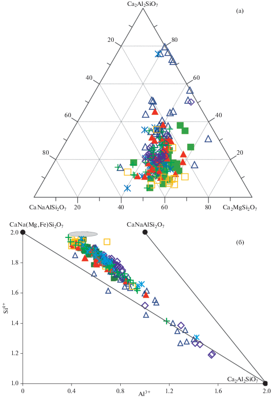 Эволюция состава мелилита происходила в ряду от геленита (реликтовые центральные зоны фенокристов) до акерманита-алюмоакерманита (Ca, Na)2(Al, Mg, Fe)Si2O7 (рис. 8). Во всех мелилитах, содержащих <1.1 форм. ед. Al, наблюдается преобладание Al над Mg и Fe в позиции T1 (рис. 8б). При концентрации Al < 0.5 форм. ед. составы минерала приближаются к наиболее глиноземистой из известных в природе разновидности алюмоакерманита (сода-мелилита), описанной в мелилит-нефелиновых пеплах и туфах вулкана Oldoinyo Lengai, Танзания (Wiedenmann et al., 2009). По-видимому, высокие концентрации Na и Al в мафических расплавах паралав приводили к кристаллизации фенокристов мелилита, в которых количество минала алюмоакерманита CaNaAlSi2O7 постепенно возрастало до 45 мас. %.
