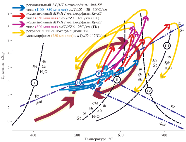 Полицикличность проявлений метаморфизма разных типов в Заангарье Енисейского кряжа, различающихся термодинамическими режимами и величинами метаморфических градиентов, подтверждается U-Pb (SHRIMP-II) и 40Ar-39Ar датировками. На первом этапе сформировались высокоградиентные зональные комплексы низких давлений And-Sil типа с гренвильским возрастом ~1050–950 млн лет при обычном для орогенеза метаморфическом градиенте dT/dH = 25–35°С/км (Ножкин и др., 2011). На втором этапе эти породы подверглись неопротерозойскому (с двумя пиками – 854–862 и 798–802 млн лет; Лиханов и др., 2011) коллизионному метаморфизму умеренных давлений Ky-Sil типа с локальным повышением давления вблизи надвигов, в результате чего происходило прогрессивное замещение And → Ky ± Sil и образование новых минеральных ассоциаций и деформационных структур. Формирование более древних метаморфических комплексов Ky-Sil типа (маяконский, тейский и чапский участки) происходило в результате надвига на Енисейский кряж блоков пород со стороны Сибирского кратона на рубеже ~850 млн лет, что подтверждается геофизическими данными и результатами исследований природы и возраста источников сноса (Лиханов и др., 2014). Поздний повторный коллизионный метаморфизм с возрастом ~800 млн лет обусловлен встречными движениями мелких блоков восточного направления в зоне оперяющих разломов более высокого порядка (гаревский и тисский участки) в результате аккреционно-коллизионных событий вальгальской складчатости (Likhanov, Santosh, 2019). Заключительные стадии развития коллизионного орогена в регионе маркируются дайковыми роями бимодальных ассоциаций анорогенных гранитоидов и внутриплитных базитов рифтогенной природы с возрастами внедрения 797–792 млн лет, связанными с неопротерозойскими процессами растяжения коры вдоль западной окраины Сибирского кратона и началом распада суперконтинента Родиния (Likhanov, Santosh, 2017).