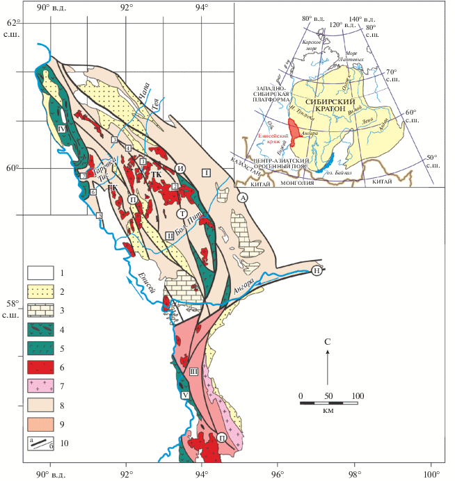 Схематическая тектоническая карта Енисейского кряжа и местоположение участков с проявлением ассоциации “тройной точки” And + Sil + Ky. ГК и ТК – гаревский и тейский метаморфические комплексы. На врезке – положение Енисейского кряжа в структуре Сибирского кратона. 1 – чехол (Pz–Kz); 2 – молассы (NP2-3); 3 – карбонатные отложения (NP2-3); 4 – офиолитовые и островодужные комплексы аккреционного пояса (NP2); 5 – окраинно-континентальные терригенно-карбонатные и метаморфические комплексы докембрия (PP3-4–NP3); 6 – порфиробластические гнейсы, гранитогнейсы и гнейсограниты гранитогнейсовых куполов (MP3–NP1); 7 – гранитоидные комплексы Татарско-Ишимбинской и Приенисейской систем разломов, в том числе щелочные сиениты (NP3), нижнеканские и посольненские граниты (Pz1) и рапакивиподобные граниты (MP3–NP3); 8 – таракские гранитоиды (PP3); 9 – вулканогенные породы Рыбинско-Панимбинского пояса (MP1–MP2); 10 – разломы (a) и прочие геологические границы (б). Тектонические блоки: I – Восточный и II – Центральный Заангарского сегмента; III – Южно-Енисейский (Ангаро-Канский) сегмент, IV – Исаковский и V – Предивинский террейны. Региональные разломы: И – Ишимбинский, Т – Татарский, П – Приенисейский, А – Анкиновский, Н – Нижнеангарский. Номера объектов исследования показаны в соответствии с рис. 1.