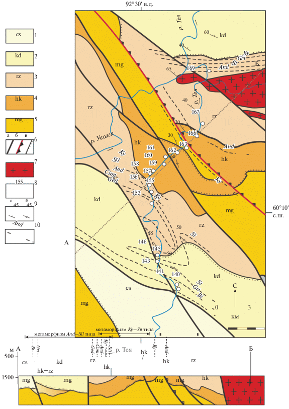 Схематическая карта тейского полиметаморфического комплекса в среднем течении р. Тея и разрез по линии А–Б. 1 – песчаники и алевролиты чингасакской серии (RF3); 2 – филлиты углеродистые и двуслюдяные с гранатом и ставролитом кристаллические сланцы кординской свиты (RF1); 3 – биотит-амфиболовые кристаллические сланцы и мраморы рязановской свиты (PR1); 4 – кристаллические сланцы с полиморфами Al2SiO5 свиты хребта Карпинского (PR1); 5 – гнейсы, кристаллические сланцы, прослои амфиболитов, метакарбонатных пород и кварцитов малогаревской толщи (PR1); 6 – (а) разломы, (б) надвиги, (в) несогласные залегания; 7 – граниты Каламинского массива; 8 – точки отбора образцов; 9 – элементы залегания пород: (а) прямое и (б) опрокинутое; 10 – изограды появления индекс-минералов.