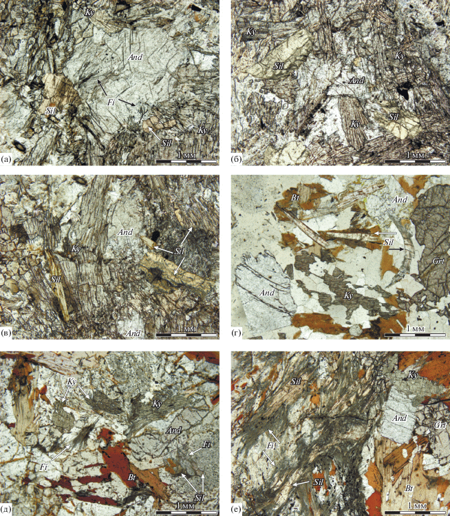 Микрофотографии петрографических шлифов метапелитов, иллюстрирующие микроструктурные взаимоотношения между полиморфами Al2SiO5. Схемы реакционных замещений для разных участков с ассоциацией “тройной точки”: (а, б – маяконский) And → Ky → → Sil ± Fi; (в – полканский) And → Ky + Sil; (г – чапский) And → Sil → Ky; (д, е –тейский) And → Sil → Ky + Fi.