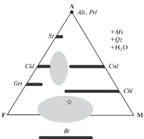 Диаграмма AFM, иллюстрирующая химические составы пород и минералов типичных (затемненный эллипс, вытянутый в направлении F–M) и железисто-глиноземистых метапелитов (затемненный эллипс, вытянутый в направлении вершины А) (Likhanov, 1988). Звездочкой показан средний состав типичных метапелитов (Ague, 1991; Symmes, Ferry, 1992).
