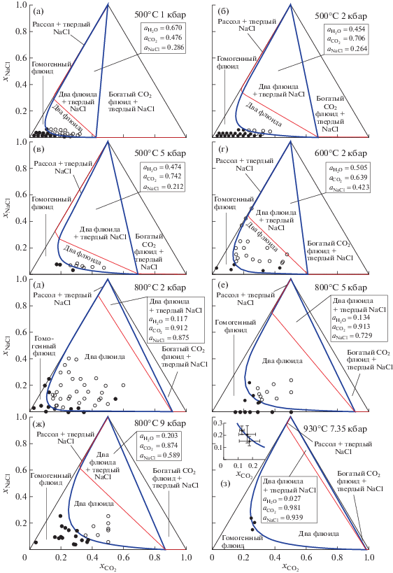Численные параметры термодинамической модели для флюидной системы H2O–CO2–NaCl были получены нами на базе двух имеющихся в литературе наборов экспериментальных данных. Прежде всего, это экспериментальные данные по фазовому состоянию системы H2O–CO2–NaCl в работах (Frantz et al., 1992; Shmulovich, Graham, 1999, 2004; Котельников, Котельникова, 1990; Johnson, 1991). Результаты этих работ, отвечающие диапазону температур от 500 до 930°C и диапазону давлений от 1 до 9 кбар, представлены на рис. 1. За исключением работы (Johnson, 1991) экспериментальными данными являются концентрации компонентов, при которых в системе присутствует гомогенный флюид или две сосуществующие флюидные фазы. На рис. 1а–1ж точки, соответствующие гомогенному флюиду, отмечены залитыми кружками. Точки, в которых было зафиксировано наличие двух сосуществующих флюидных фаз, отмечены незалитыми кружками. В работе (Johnson, 1991) для T ≈ 930°C и P ≈ 7.35 кбар были получены три точки, лежащие на границе разделяющей области гомогенного и двухфазного флюида – сольвусе, или бинодали (Diamond, 2003; Heinrich, 2007). Эти точки с полученными в (Johnson, 1991) погрешностями представлены на врезке к рис. 1з.