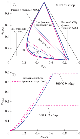 На рис. 2б для двух комбинаций температуры и давления, представленных в (Аранович и др., 2010), приведено сравнение зависимости активности NaCl от концентрации соли в системе, не содержащей CO2. В области относительно низких концентраций NaCl (отсутствие твердой соли) видны небольшие различия кривых ${{a}_{{{\text{NaCl}}}}}({{x}_{{{\text{NaCl}}}}}).$ При больших концентрациях NaCl, отвечающих равновесному сосуществованию флюида и твердого NaCl (горизонтальные части кривых на рис. 2б), концентрация и активность NaCl во флюиде не зависят от полного количества NaCl в системе. В этой области наши значения ${{a}_{{{\text{NaCl}}}}}({{x}_{{{\text{NaCl}}}}})$ практически совпадают с полученными по модели (Аранович и др., 2010).