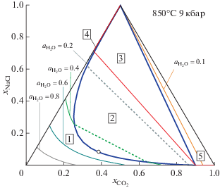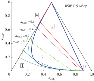 На рис. 3 представлены значения активности воды в зависимости от состава флюидной системы H2O–CO2–NaCl при P = 9 кбар и T = 850°C. В области-1 (поле гомогенного флюида) даны изолинии активности для нескольких ее значений. В области-2 (поле бинарного флюида) активность воды в сосуществующих флюидах определяется коннодами, соединяющими точки пересечения изолиний активности с сольвусом. Значения активности воды в области-2 изменяется от ${{a}_{{{{{\text{H}}}_{{\text{2}}}}{\text{O}}}}} = 0.476$ в критической точке (${{x}_{{{\text{C}}{{{\text{O}}}_{{\text{2}}}}}}} = 0.3429,$ ${{x}_{{{\text{NaCl}}}}} = 0.0832$) до ${{a}_{{{{{\text{H}}}_{{\text{2}}}}{\text{O}}}}} = 0.148$ на границе с областью-3. В этой области (две флюидные фазы плюс твердый NaCl) активность воды при заданных температуре и давлении имеет постоянное значение ${{a}_{{{{{\text{H}}}_{{\text{2}}}}{\text{O}}}}} = 0.148.$ Составы двух флюидных фаз, сосуществующих в этой области с твердым NaCl также постоянны: ${{x}_{{{\text{C}}{{{\text{O}}}_{{\text{2}}}}}}} = 0.8988,$ ${{x}_{{{\text{NaCl}}}}} = 0.0038$ и ${{x}_{{{\text{C}}{{{\text{O}}}_{{\text{2}}}}}}} = 0.0076,$ ${{x}_{{{\text{NaCl}}}}} = 0.7072.$ Активности CO2 и NaCl во флюидных фазах в этой области составов постоянны и имеют значения ${{a}_{{{\text{C}}{{{\text{O}}}_{{\text{2}}}}}}} = 0.906,$ ${{a}_{{{\text{NaCl}}}}} = 0.690$ соотвественно. Это же значение активности NaCl сохраняется в области-5 (богатая CO2 флюидная фаза, равновесная с твердым NaCl). Активность воды в этой области принимает значения от 0.148 до 0. Изолиния для ${{a}_{{{{{\text{H}}}_{{\text{2}}}}{\text{O}}}}} = 0.1,$ проходящая в этой области, представлена на рис. 3. В области-4 (рассол плюс твердый NaCl) активность воды изменяется (вдоль линии ${{x}_{{{\text{C}}{{{\text{O}}}_{{\text{2}}}}}}} = 0$) в пределах от нуля до ${{a}_{{{{{\text{H}}}_{{\text{2}}}}{\text{O}}}}} = 0.152.$