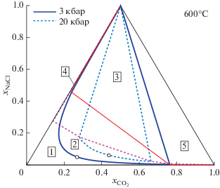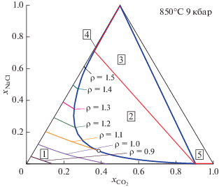 Для тех же значений температуры и давления (T = 850°C и P = 9 кбар) изолинии активности и конноды для CO2 представлены на рис. 4. Изолинии ${{a}_{{{\text{C}}{{{\text{O}}}_{{\text{2}}}}}}} = 0.2,$ ${{a}_{{{\text{C}}{{{\text{O}}}_{{\text{2}}}}}}} = 0.4$ и ${{a}_{{{\text{C}}{{{\text{O}}}_{{\text{2}}}}}}} = 0.6$ полностью лежат в области гомогенного флюида. Коннода ${{a}_{{{\text{C}}{{{\text{O}}}_{{\text{2}}}}}}} = 0.8$ соединяет концы двух участков изолинии ${{a}_{{{\text{C}}{{{\text{O}}}_{{\text{2}}}}}}} = 0.8.$ Верхний участок изолинии практически совпадает с сольвусом. Короткий нижний участок лежит в области гомогенного флюида, бедного NaCl и богатого CO2. В области сосуществования двух флюидных фаз активность CO2 возрастает от значения ${{a}_{{{\text{C}}{{{\text{O}}}_{{\text{2}}}}}}} = 0.626$ в критической точке до ${{a}_{{{\text{C}}{{{\text{O}}}_{{\text{2}}}}}}} = 0.906$ на границе с областью-3. Коннода, соединяющая точки пересечения верхнего и нижнего участков изолинии ${{a}_{{{\text{C}}{{{\text{O}}}_{{\text{2}}}}}}} = 0.9$ с сольвусом, лежит вблизи границы области двухфазного флюида и области-3 (двухфазный флюид, сосуществующий с твердым NaCl), в которой активность CO2 имеет значение 0.906. Дальнейшее повышение активности CO2 происходит в области-5, преимущественно углекислотного флюида, сосуществующего с твердым NaCl.