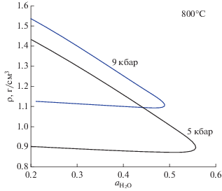Значения плотности флюида на сольвусе в зависимости от активности воды. Точки на верхней и нижней ветвях кривых, отвечающие одной и той же активности воды, соответствуют плотностям сосуществующих флюидных фаз. Верхняя ветвь каждой кривой – плотность флюида с высоким содержанием соли. Нижняя ветвь – преимущественно водно-углекислотный флюид с малым содержанием NaCl.