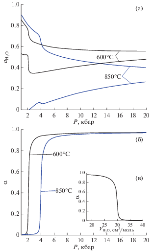 Для двух значений температуры зависимости от давления минимальной и максимальной активности воды в области сосуществования двух флюидных фаз представлены на рис. 9а. Для обоих значений температуры при давлениях выше 4 кбар (850°C) и 3 кбар (600°C) увеличение давления приводит к монотонному сближению минимальных и максимальных значений ${{a}_{{{{{\text{H}}}_{{\text{2}}}}{\text{O}}}}}.$ Для данных величин давления представленные на рис. 9б зависимости $\alpha (P)$ показывают практически полную диссоциацию молекул NaCl. Однако при минимальных величинах давления, представленных на рис. 9б, степень диссоциации NaCl близка к нулю. Резкий переход от режима слабого к режиму сильного электролита происходит при P ≈ 2 кбар для T = 600°C и при P ≈ 4 кбар для T = 850°C. Это резкое изменение свойств бинарной подсистемы H2O–NaCl служит причиной особенностей, видимых на кривых рис. 9а.