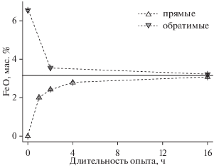 На рис. 1 представлены результаты опытов по растворимости железа в зависимости от времени выдержки. Как видно из рис. 1, для достижения равновесия в гаплобазальтовом расплаве DA при температуре 1400°C требуется минимум 8 ч. Для этой выдержки среднее содержание FeO (3.16 мас. %) близко к таковому в прямом (3.08 ± 0.02%) и обратимом (3.23 ± 0.03%) опытах, хотя и несколько выходит за пределы ошибки анализа. Интересно, что для опытов с длительностью 2 ч подход сверху дает “более равновесные” результаты (избыток FeO относительно равновесного содержания составляет 0.39%), чем подход снизу (дефицит FeO относительно равновесного содержания составляет 0.73%).