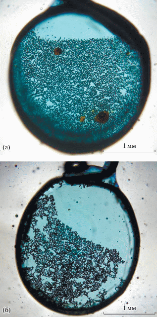 Принимая вес экспериментальных стекол за 15–20 мг, можно подсчитать, что из расплава, предварительно наплавленного при 10–11.8 атм., в ходе обратимых экспериментов при 10–12.6 атм. выпало 0.3–0.5 мг железа в виде металла. Содержание FeO в данных стеклах не превышает 3.6 мас. %, при этом доля Fe2O3 пренебрежимо мала (рассчитанное по модели (Borisov et al., 2018) соотношение Fe3+/Fetot < < 0.009). Экспериментальные стекла прозрачные, бледно-голубого цвета. Выпавшее металлическое железо в стеклах может быть изучено с помощью оптического микроскопа. Общий вид образцов DAFeR-62 и DAFeR-60 показан на рис. 2. Поскольку выпадение железа в ходе обратимых опытов начиналось с поверхности расплава, висящего в петле, в закаленных образцах оно должно быть сконцентрировано вблизи поверхности стеклянной таблетки. Одна поверхность таблетки отполирована, но выделения металлического железа, сконцентрированные на другой поверхности, хорошо видны сквозь прозрачное стекло образцов.