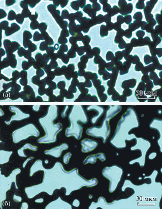 Из рис. 2 видно, что опыты с длительностью 2 и 16 ч резко отличаются. В образце DAFeR-62 кристаллы железа размером около 15 мкм четко выражены и связаны в своеобразную “сеть”, покрывающую почти всю поверхность стекла. В образце DAFeR-60 “сеть” сильно разрушена, а выделения железа потеряли кристаллический габитус. Разница между образцами еще более заметна при большом увеличении (рис. 3). В образце DAFeR-62 не вызывает сомнения кристаллическая природа выделений железа. Напротив, в образце DAFeR-60 форма скоплений железа создает полную иллюзию того, что исходное железо до закалки было расплавленным. Еще раз подчеркнем, что температура опытов (1400°С) поддерживалась примерно на 140°С ниже точки плавления чистого железа.