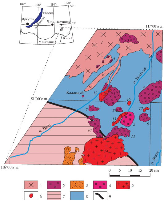 Схематическая геологическая карта кукульбейского рудного района по Г.П. Зарайскому и др. (2009) с дополнениями и изменениями. На врезке – схема географического расположения изучаемых массивов. 1 – ундинский гранит-гранодиоритовый комплекс (P1); 2 – шахтаминский монцодиорит-гранодиорит-гранитовый комплекс (J2–3); 3 – шадоронский субвулканический андезидацитовый комплекс (J2–3); 4 – олдондинский граносиенит-гранитовый комплекс (J3); 5–6 – кукульбейский гранит-лейкогранитовый комплекс (J3): 5 – граниты и лейкограниты (пунктиром обозначена вне масштаба выделяемая авторами ранняя фаза), 6 – литий-фтористые граниты; 7 – Агинско-Борщевочная аккреционная структурная зона: амфиболиты и гнейсы (PR1), вулканогенно-осадочные породы (PZ2–3), 8 – Газимуро-Аргунская структурно-формационная зона: терригенные отложения ононской и ононско-борзинской серий (J1–2): аргиллиты, алевролиты, песчаники, конгломераты; 9 – Восточно-Агинский структурный шов. Цифры на карте: 1 – Шундуинский массив ундинского комплекса; 2 – Олдондинский массив олдондинского комплекса; 3–12 – шахтаминский комплекс, массивы: 3 – Белухинский, 4 – Букукинская группа, 5 – Тургинский, 6 – Курунзулайский, 7 – Ноцуйский, 8 – Бырохчанский, 9 – Амныкенский, 10 – Антийский, 11 – Северо-Соктуйский; 12–14 – кукульбейский комплекс, массивы гранитов и лейкогранитов: 12 – Турга-Кулиндинский, 13 – Антоновогорский, 14 – Соктуйский; 15–17 – массивы и штоки литий-фтористых гранитов: 15 – Тургинская группа штоков, 16 – Этыкинский массив, 17 – Ачиканский массив.