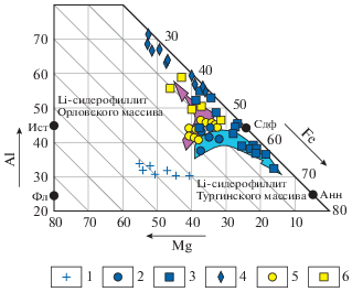 Различный характер эволюции состава литиево-железистых слюд Тургинского и Орловского массивов на диаграмме минальных составов (Козлов и др., 1978). Слюды Тургинского массива: шахтаминский комплекс, гранодиориты: 1 – биотит; кукульбейский комплекс: биотитовые граниты: 2 – биотит, протолитионитовые граниты: 3 – Li-сидерофиллит, амазонитовые граниты: 4 – циннвальдит; слюды Орловского массива: биотитовые граниты: 5 – биотит; протолитионитовые граниты: 6 – Li-сидерофиллит. Стрелки отражают различные тенденции эволюции состава слюд. Ист – истонит, Фл – флогопит, Сдф – сидерофиллит, Анн – аннит.