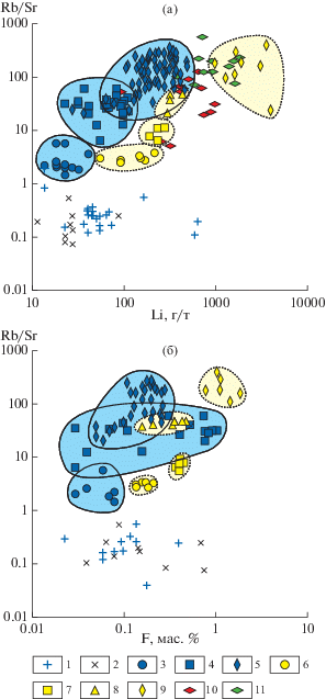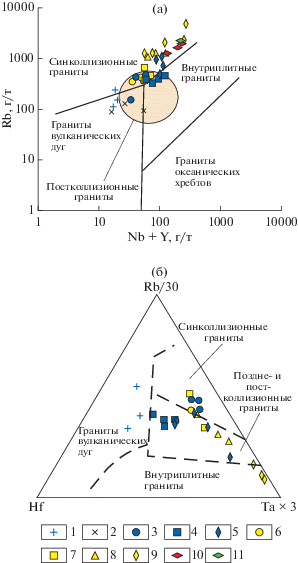 Составы изучаемых редкометальных гранитов на дискриминационных диаграммах Дж.Пирса и др. (Pearce et al., 1984) (а) и Н. Харриса и др. (Harris et al., 1986) (б). Породы шахтаминского комплекса: 1 – Тургинский массив, 2 – Хангилайский интрузив; 3–11 – породы кукульбейского комплекса: Тургинский массив: 3 – порфировидные биотитовые граниты, 4 – протолитионитовые граниты, 5 – амазонитовые граниты; Хангилайский и Орловский массивы: 6 – биотитовые граниты, 7 – протолитионитовые граниты, 8 – порфиробластовые граниты, 9 – амазонитовые граниты; Этыкинский массив: 10 – амазонитовые граниты; Ачиканский массив: 11 – амазонитовые граниты.