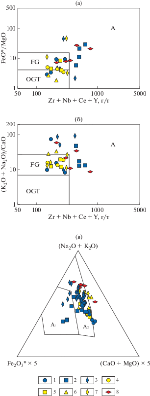 Составы пород Тургинского, Хангилайского, Орловского массивов на диаграммах Дж. Вейлина (Whalen et al., 1987) (а, б) и на тройной петрогенетической диаграмме А.В. Гребенникова (Гребенников, 2014) (в). Тургинский массив: 1 – порфировидные биотитовые граниты, 2 – протолитионитовые граниты, 3 – амазонитовые граниты; Хангилайский и Орловский массивы: 4 – биотитовые граниты, 5 – протолитионитовые граниты, 6 – порфиробластовые граниты, 7 – амазонитовые граниты; Этыкинский массив: 8 – амазонитовые граниты. Поля на диаграммах: A – граниты A‑типа; FG – фракционированные граниты; OGT – нефракционированные граниты M-, I- и S-типов; А1 – поле кремнекислых пород внутриплитных геодинамических обстановок: океанических островов и континентальных рифтов; А2 – кислые магматические ассоциации, проявленные в геодинамических условиях внутри- и окраинно-континентального типов.