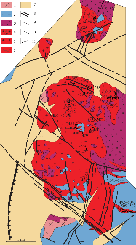 Схема строения Тургинского массива по материалам Березовикова И.П. и Лаврушина В.В., 1983; с дополнениями авторов. 1 – палеозойские отложения; 2 – терригенные отложения онтагинской свиты, J1; 3 – породы шахтаминского комплекса, J2–3; кукульбейский комплекс, J3-K1: 4 – порфировидные биотитовые граниты, 5 – протолитионитовые граниты, 6 – амазонитовые граниты; 7 – четвертичные отложения; 8 – разрывные нарушения; 9 – достоверные геологические границы; 10 – предполагаемые геологические границы; 11 – точки опробования с номерами проб.