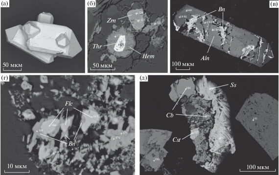 Формы проявления и характер взаимоотношений акцессорных минералов в гранитоидах Тургинского массива. (а) – срастание циркона из протолитионитовых гранитов, (б) – торит в гематитовой оторочке в полевом шпате, (в) – развитие бастнезита по алланиту, (г) – развитие бастнезита по флюоцериту, (д) – Fe-колумбит в ассоциации с касситеритом и минералом группы самарскита. Zrn – циркон, Thr – торит, Hem – гематит, Aln – алланит, Bn – бастнезит, Flc – флюоцерит, Cb – колумбит, Cst – касситерит, Ss – самарскит.