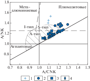 Соотношение глиноземистости монцонитоидов шахтаминского комплекса и гранитов кукульбейского комплекса Тургинского массива. 1 – монцонитоиды шахтаминского комплекса, 2 – порфировидные биотитовые граниты, 3 – протолитионитовые граниты, 4 – амазонитовые граниты. Сплошные линии разделяют поля агпаитовых, нормальных и плюмазитовых пород, пунктирные – поля гранитов I-, S- и A-типов по (Maeda, 1990), штриховкой показано поле посторогенных гранитов по (Maniar, Piccoli, 1989).