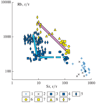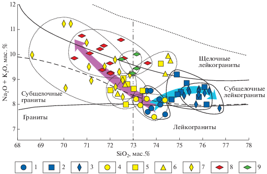Сравнение порфировидных биотитовых гранитов Тургинского массива с аналогичными гранитами Хангилайского интрузива показывает близость их петрохимического состава и существенное различие в содержании ряда литофильных элементов, прежде всего Li, F, Sr, Ba, при сходной концентрации Rb, Ta, Nb. Более показательно различие в составе расплавов (табл. 2). Так, расплав Тургинского массива изначально обогащен на порядок REE, в меньшей мере U, Th, Y, в то время как в расплаве Орловского массива установлены более высокие содержания лития и бора по сравнению с расплавом лейкогранитов Тургинского массива. Сопоставление рядов дифференциатов изучаемых массивов вскрывает как общие закономерности эволюции их составов, так и отличительные черты. Общей закономерностью эволюции состава является уменьшение содержаний Mg, Ti, Ca, накопление характерной ассоциации литофильных редких элементов – Li, Rb, Cs, F, Ta, Nb, Sn. Различие заключается в значительно более низких их содержаниях в Тургинском массиве. Однако главную особенность дифференциации Тургинского массива составляет принципиально иной характер распределения петрогенных элементов – Si, Al, суммарного содержания щелочей. Как видно из рис. 5, в ряду дифференциатов рудоносных массивов происходит последовательное уменьшение кремнекислотности при возрастании глиноземистости и щелочности (Na2O + K2O). В Тургинском массиве, напротив, увеличивается содержание кремнезема при некотором уменьшении глиноземистости и отсутствии накопления щелочей. В результате тренды дифференциации рудоносных массивов и Тургинского массива характеризуются принципиально различной направленностью.