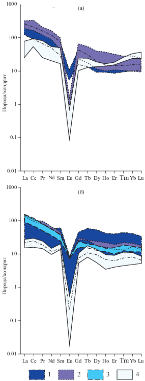 По петрохимическому составу и повышенному содержанию литофильных редких элементов и фтора лейкограниты Тургинского массива отвечают геохимическому типу редкометальных плюмазитовых гранитов, по Л.В. Таусону (1977), (рис. 4). При этом породы выделяемых трех фаз весьма близки по петрохимическому составу (табл. 1). В предполагаемом ряду дифференциатов прослеживается слабо выраженная тенденция уменьшения содержаний (на уровне десятых долей процента) титана, кальция и магния, а также снижение содержания алюминия и повышение доли натрия в амазонитовых гранитах. В этом процессе отмечается также некоторое накопление литофильных редких элементов (Li, Ta, Nb, F), менее значительное по сравнению с рудоносными массивами амазонитовых гранитов. Отличительной особенностью лейкогранитов Тургинского массива является заметное повышение железистости протолитионитовых гранитов по сравнению с биотитовыми гранитами (2.17 ± 1.09 и 1.55 ± 0.27 мас. % FeOtot соответственно).