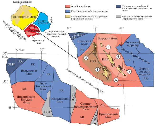 В состав Восточно-Европейского кратона входят три мегаблока: Сарматия, Волго-Уралия и Фенноскандия. Восточная Сарматия включает архейские блоки: Курский (в пределах Воронежского кристаллического массива), Приазовский и Среднеприднепровский (в пределах Украинского щита), обрамляемые палеопротерозойскими структурами (рис. 1).
