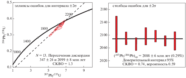 При метаморфизме амфиболитовой фации в породах основного состава происходит замещение имеющегося бадделеита цирконом либо перекристаллизация исходного циркона под воздействием метаморфического флюида. Форма новообразованных метаморфических цирконов, как правило, изометричная или короткопризматическая. Основной чертой внутреннего строения метаморфических цирконов, проявленной как в отраженных электронах, так и в катодолюминесценции, является отсутствие четко выраженной ростовой зональности либо наличие тонких обрастаний (кайм) на цирконе предыдущей генерации (Каулина, 2010 и ссылки в ней). Цирконы из обр. 4315/491 имеют хорошо сформированные грани и вершины, а также тонкую эвгедральную зональность, что указывает на их магматическое происхождение и отсутствие сколько-нибудь значимых метаморфических изменений. К тому же возраст регионального метаморфизма в пределах Курского блока и Волго-Донского орогена неоднократно датирован как ~2.07 млрд лет, что моложе возраста цирконов из метаандезибазальтов на 30 млн лет.