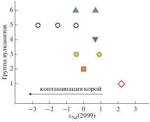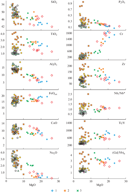 Низкие значения Mg# и концентраций совместимых элементов, таких как Cr и Ni, указывают на эволюционный характер вулканитов, связанный с фракционной кристаллизацией родительских магм. В то же время сходный диапазон концентраций главных петрогенных оксидов (SiO2, Al2O3, Fe2O3, MgO, CaO и Na2O) на диаграммах MgO–элемент (рис. 7) предполагает, что метабазиты из каждой группы не являются производными друг друга. Различная степень обогащения легкими лантаноидами, наличие отрицательной Nb-аномалии и низкорадиогенный изотопный состав неодима εNd(2099) от +0.9 до –2.7 указывают на разную степень коровой контаминации мантийных расплавов.