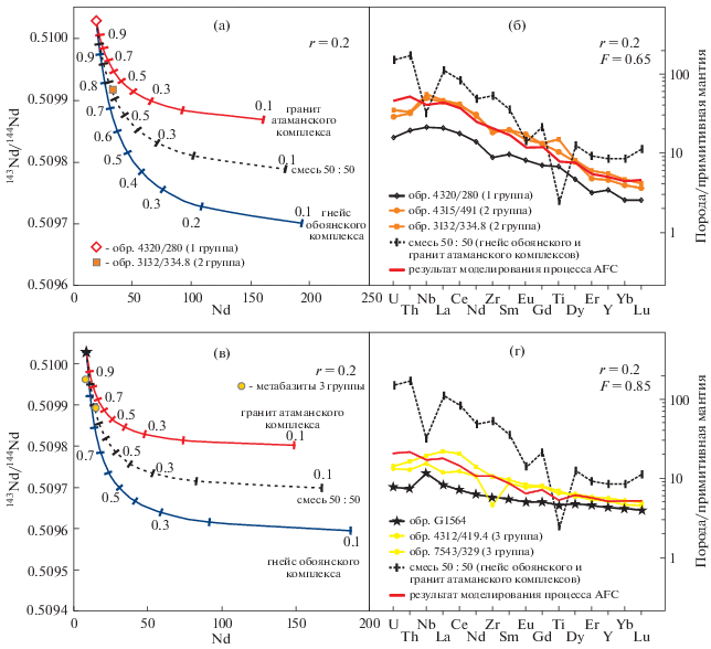 Диаграммы для метабазитов групп 2 (а, б) и 3 (в, г) с линиями процесса AFC для предполагаемого исходного расплава и разновозрастных коровых контаминантов. Черточки и цифры на линиях соответствуют доле оставшегося расплава (F), значения 143Nd/144Nd рассчитаны на возраст 2099 млн лет.