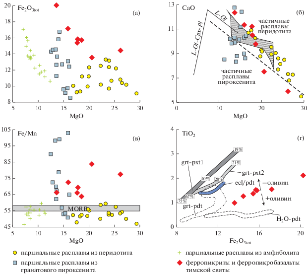 Ферропикриты и ферропикробазальты тимской свиты в сравнении с экспериментальными парциальными расплавами (а–в) на основе перидотита при 3–7 ГПа, пироксенита при 2.5–7 ГПа и амфиболита при 1.5 ГПа. (г) grt-pxt1 – гранатовый пироксенит при 5 ГПа, grt-pxt2 – гранатовый пироксенит при 2.5 ГПа, ecl/pdt – смесь эклогит–перидотит при давлении 3.5 ГПа, grt-pdt – гранатовый перидотит при 4–7 ГПа, H2O-pdt – перидотит, насыщенный H2O при 5–11 ГПа. Цифры с процентами – степень плавления в опытах с пироксенитом. Источник данных для (а–в) по (Zhang et al., 2017 и ссылки в ней), для (г) по (Heinonen, Luttinen, 2008 и ссылки в ней). Заштрихованная область на (б) обозначает первичные частичные расплавы перидотита. Вулканиты с содержанием CaO ниже пунктирной линии являются потенциальными частичными расплавами пироксенита или частичными расплавами с высокой степенью перидотита, подвергшимися фракционной кристаллизации оливина.