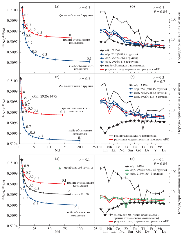 Диаграммы для метабазитов групп 5 (а–г) и 6 (д, е) с линиями процесса AFC для предполагаемого исходного расплава и разновозрастных коровых контаминантов. Звездочкой показан предполагаемый исходный расплав. Черточки и цифры на линиях соответствуют доле оставшегося расплава (F), значения 143Nd/144Nd рассчитаны на возраст 2099 млн лет.
