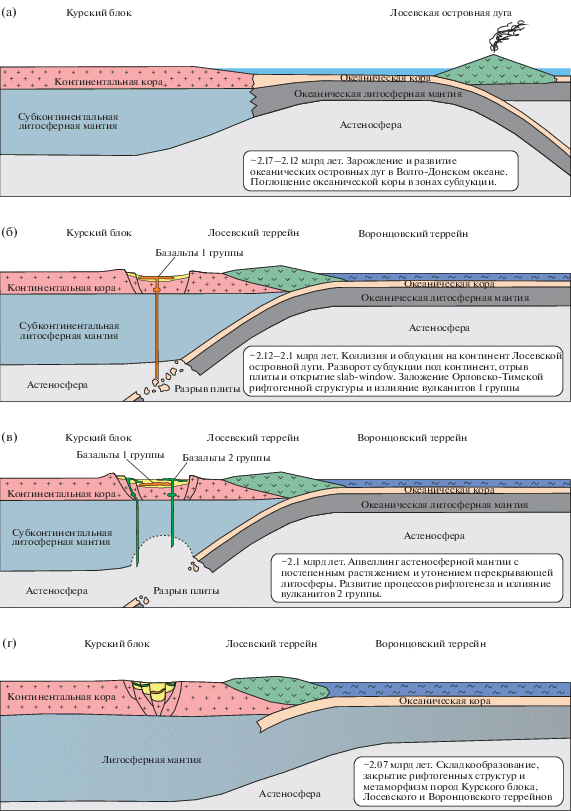 К настоящему времени в палеопротерозое на территории Курского блока и Волго-Донского орогена можно зафиксировать ряд реперных событий: (1) закрытие Волго-Донского океана ~2.2–2.1 млрд лет (Terentiev et al., 2017), (2) начало коллизии Курского блока и Волго-Донского орогена ~2.1 млрд лет (Щипанский и др., 2007) и (3) региональный метаморфизм ~2.07 млрд лет (Savko et al., 2018). Полученные нами данные о возрасте основных вулканитов позволяют ограничить время формирования Орловско-Тимской рифтогенной структуры интервалом ~2.1–2.07 млрд лет. Подобная синхронизация рифтообразования на Курском блоке и конвергентных – коллизионных – процессов в смежном Волго-Донском океане, в совокупности с эволюцией вулканитов от глубинных ферропикритов до малоглубинных толеитов, позволяет утверждать, что базитовый вулканизм в пределах Орловско-Тимской рифтогенной структуры связан с прекращением субдукции океанической плиты на рубеже около 2.1 млрд лет под континентальную окраину Курского блока. Отрыв субдуцируемой океанической плиты привел к образованию плитного окна (slab-window), что инициировало апвеллинг астеносферной мантии с постепенным растяжением и утонением перекрывающей литосферы, развитие процессов рассеянного рифтогенеза и базальтового магматизма (рис. 16).
