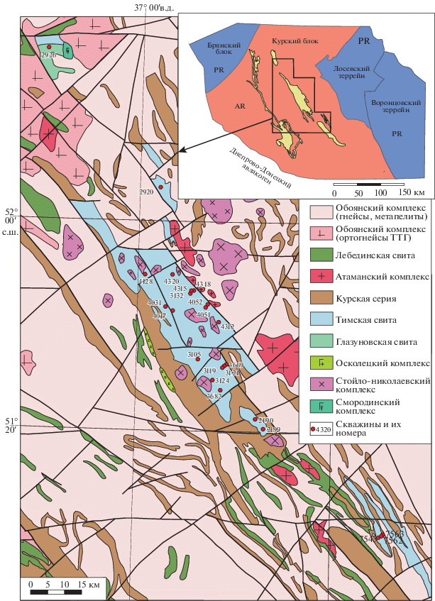 Архейская кора Курского блока включает палеоархейское ядро в центральной части и мезоархейскую гранит-зеленокаменную область, примыкающую с запада (Savko et al., 2020) (рис. 1). Палеоархейское ядро сложено преимущественно ортогнейсами, мигматитами, метапелитами, породами железисто-кремнистой формации в составе обоянского комплекса. Возраст протолитов ортогнейсов (ТТГ) около 3.55 млрд лет. U-Pb возраст детритовых цирконов из метапелитов попадает в три кластера: 3535–3556, 3464–3472 и 3334–3384 млн лет (Savko et al., 2020). Гранит-зеленокаменная область состоит из батолитов ТТГ-ассоциации салтыковского комплекса и разделяющих их зеленокаменных поясов петельчатой формы, сложенных вулканогенно-осадочными породами александровской свиты. Возраст ТТГ-гнейсов оценивается как 3.05–2.96 млрд лет (Савко и др., 2019а). Нижние части разреза александровской свиты состоят из метаморфизованных коматиит-базальтовых потоков, переходящих вверх по разрезу в толеитовые метабазальты с редкими прослоями метаосадочных пород, железистых кварцитов и кислых метавулканитов (Савко и др., 2017). Возраст метариолитов из вулканогенно-осадочного разреза зеленокаменного пояса составляет 3122 ± 9 млн лет (Савко и др., 2019б). Гранулитовый метаморфизм и консолидация коры Курского блока имели место на рубеже около 2.8 млрд лет (Savko et al., 2018). В интервале ~2.8–2.6 млрд лет предполагается заложение рифтовых структур и излияния основных вулканитов лебединской свиты (Савко и др., 2017). Завершается архейская история Курского блока внедрением вулканоплутонической ассоциации внутриплитных риолитов и гранитов атаманского комплекса с возрастом 2610 ± 10 млн лет (Savko et al., 2019).
