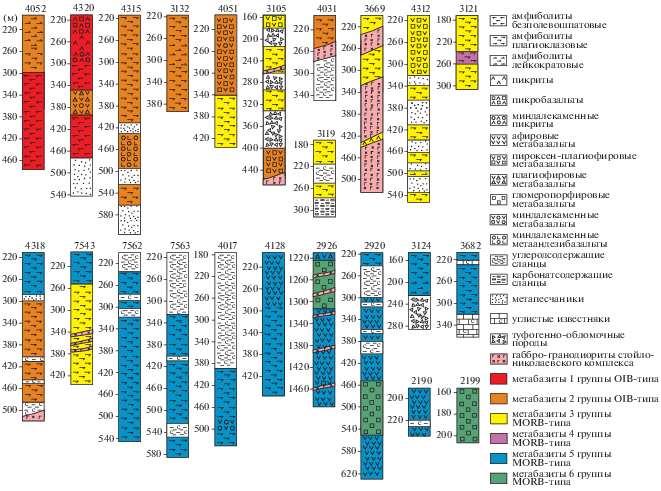 Разрезы скважин, вскрывших метавулканиты тимской свиты. Нумерация скважин вверху каждой колонки, крап соответствует петрографическим разновидностям, цвет – геохимическим группам.