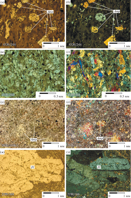 Фото шлифов метавулканитов и амфиболитов тимской свиты: (а, б) – метапикробазальт (обр. 4320/244), (в, г) – безполевошпатовый амфиболит (обр. 4320/280), (д, е) – пироксен-плагиофировый метабазальт (обр. 2926/1456.1), (ж, з) – гломеропорфировый метабазальт (обр. 2199/168). (а, в, д, ж) – без анализатора, (б, г, е, з) – николи скрещены. Amf – амфибол, Pl – плагиоклаз.