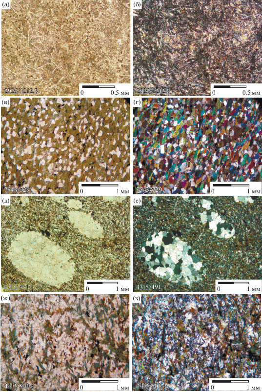 Фото шлифов метавулканитов и амфиболитов тимской свиты: (а, б) – афировый метабазальт (обр. 2926/1212.8), (в, г) – плагиоклазовый амфиболит (обр. 7543/329), (д, е) – миндалекаменный метаандезибазальт (обр. 4315/491), (ж, з) – лейкократовый амфиболит (обр. 4312/500.4). (а, в, д, ж) – без анализатора, (б, г, е, з) – николи скрещены.