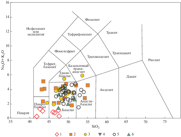 Все метавулканические породы имеют широкие вариации содержаний породообразующих оксидов (табл. 1). Сумма щелочей (Na2O + K2O) изменяется от 0.1 до 5.9 мас. %, при преобладании Na2O над K2O. Магнезиальность (Мg#) варьирует от 0.28 до 0.78. На классификационной диаграмме SiO2–(Na2O + K2O) точки составов пород попадают в поля базальтов, андезибазальтов, редко пикробазальтов (рис. 6). Разности с содержанием MgO от 16 до 26 мас. % и Fe2O3tot > 14 мас. %, в соответствии с классификацией вулканических пород по химическому составу (Le Maitre et al., 2002), являются ферропикритами и ферропикробазальтами. Разности основного состава также характеризуются повышенными концентрациями Fe2O3tot и, в соответствии с Петрографическим кодексом (Богатиков и др., 2009), являются железистыми базальтами при Кф = 65–75 и ферробазальтами при Кф = 76–84 (табл. 1).