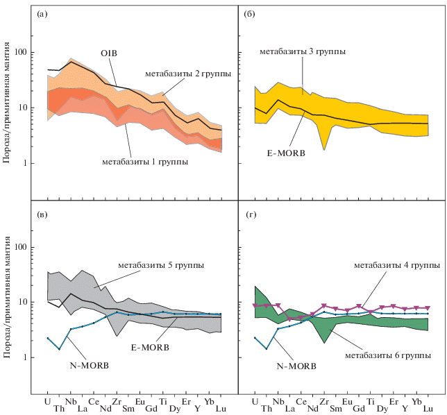 Метабазиты второго MORB-типа имеют более широкое ареальное распространение и выявлены в пределах Орловской, Тим-Ястребовской и Авильской структур. Они венчают разрез тимской свиты и чаще всего ассоциируют с углеродсодержащими сланцами либо с карбонатсодержащими породами. Главными геохимическими критериями, позволяющими объединить метабазиты 3–6 групп во второй тип, являются значения (Gd/Yb)n < < 2 и Ti/Y < 500, указывающие на малоглубинный безгранатовый источник магмогенерации.