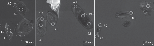 U-Pb изотопное датирование. Проба весом около 1 кг отбиралась из керна наименее измененных пород. Во избежание вероятности технической контаминации дробилась вручную до крупности 0.4 мм, промывалась до серого шлиха и разделялась в бромоформе. Кристаллы циркона отбирались под бинокуляром из фракции с d > 2.9 г/см3. Отобранные кристаллы совместно со стандартами “91500” и “TEMORA” были зафиксированы смолой Epofix в пределах шайбы диаметром 25 мм, которая шлифовалась абразивом до выведения кристаллов на поверхность. С помощью сканирующего электронного микроскопа CamScan MX2500 были получены катодолюминесцентные изображения, что позволило выбрать подходящие, с точки зрения методологии U-Pb датирования, координаты точек локального микрозондового исследования в пределах изучаемых кристаллов цирконов. Подготовленные таким способом цирконы анализировались с помощью мультиколлекторного вторично-ионного масс-спектрометра высокого разрешения SHRIMP-II в Центре изотопных исследований ВСЕГЕИ, г. Санкт-Петербург, по стандартной методике (Larionov et al., 2004) с использованием эталонных цирконов “91500” и “Temora”. При расчетах использовали константы распада, предложенные в работе (Steiger, Jäger, 1977), и вводили поправку на нерадиогенный свинец по (Stacey, Kramers, 1975) на основе измеренного отношения 204Pb/206Pb. Полученные результаты обрабатывали с помощью программы “SQUID v1.12” (Ludwig, 2005) и “ISOPLOT/Ex 3.6” (Ludwig, 2008).
