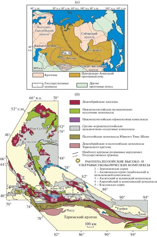 В структуре западной части Центрально-Азиатского орогенного пояса, включающей складчатые сооружения Казахстана, Кыргызстана и северо-западной части Китая, выделяются крупные докембрийские сиалические массивы, которые обрамляются палеозойскими интенсивно дислоцированными офиолитами, островодужными и флишевыми комплексами. В строении фундамента докембрийских массивов принимают участие различные метаморфические комплексы, при этом некоторые из них испытали метаморфизм высоких и сверхвысоких давлений в раннем палеозое (~480–530 млн лет). К таким комплексам относятся зерендинская серия Кокчетавского массива в Северном Казахстане, акджонская серия Иссыккульского массива в Северном Тянь-Шане, актюзский, кеминский и кояндинский комплексы Чуйско-Кендыктасского и Жельтавского массивов в Южном Казахстане, кассанская серия Ишим-Нарынского массива в Срединном Тянь-Шане. Представлен обзор результатов изучения особенностей состава, строения и метаморфической эволюции высоко- и ультравысокобарических образований, а также пород умеренных ступеней, входящих в состав этих комплексов. В ходе исследований, проводившихся в течение последних тридцати лет, были получены многочисленные Р-Т оценки параметров формирования пород на пике метаморфизма, а также на регрессивной и в редких случаях прогрессивной стадиях. Для большей части изученных высоко- и ультравысокобарических пород получены оценки возраста, соответствующие времени проявления пикового или околопикового этапа метаморфизма, а иногда и более поздних этапов диафтореза. Рассмотрены проблемы, возникающие при построении геодинамических моделей формирования (ультра-) высокобарических комплексов различных массивов западной части Центрально-Азиатского пояса. Показано, что для построения обоснованных моделей необходима более детальная информация о составах, возрастах, обстановках формирования протолитов ключевых разностей (ультра-) высокобарических пород и комплексов умеренных давлений, а также образований палеозойских структурно-формационных зон, обрамляющих докембрийские массивы.
